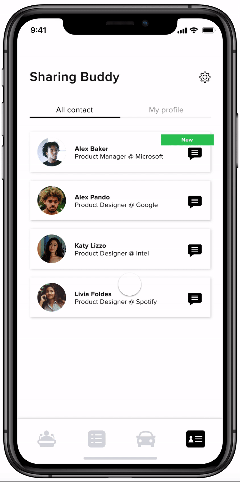 After the ride, users have the option to exchange business card with their ride sharing buddy.